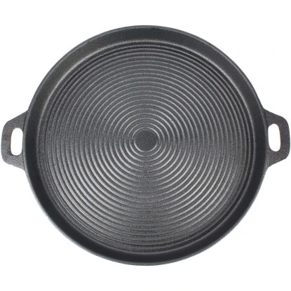 Hochwertige El Fuego Grillpfanne aus massivem emailliertem Gusseisen, die bereits mit pflanzlichen Ölen voreingebrannt ist. Die Grillpfanne hat mit zwei Handgriffe.